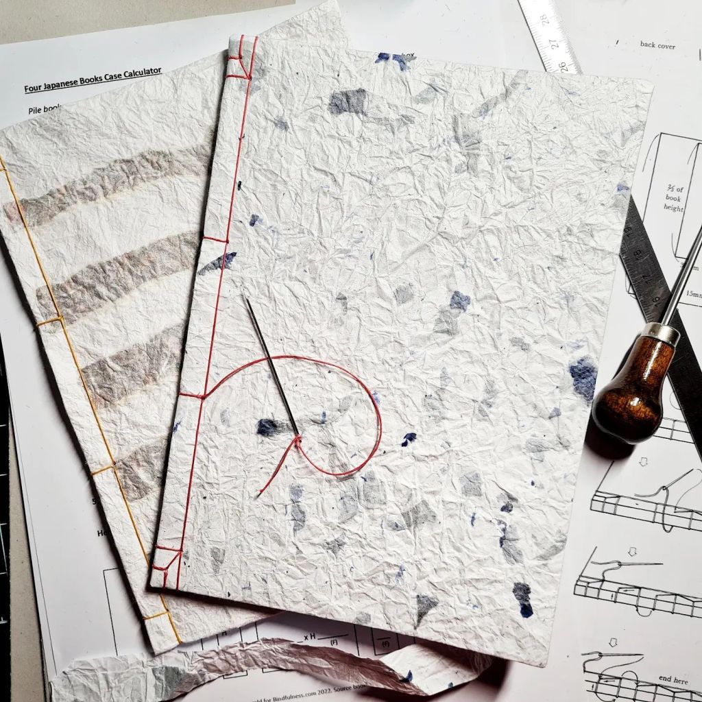 Japanese style books are ideal for single sheets, and though they are referred to here as Japanese Stab binding, this tradition of binding was common in East Asia, with Chinese and Korean traditions having variations in the number of sewing holes. We’ll make four different soft cover handbound books Inspired by Master Craftsman Kojiro Ikegami using variations of the gorgeous and elegant four-hole stab binding method – Yotsume toji (4 Hole Binding), Koki Toji (Noble Binding), Kikko Toji (Tortoise Shell Binding), and the Asa-No-Ha Toji (Hemp Leaf Binding).