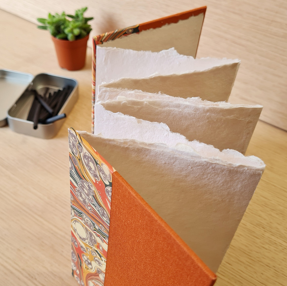 The Concertina is also known as accordion or leporello. These seemingly simple zigzag shapes allow an exploration of the folded book. We will make two books in a Bindfulness workshop – one with a simple fold, and a second with double leaves. The double leaved book offers the advantage of discrete working surfaces on both sides of the concertina, so there’s no working onto the back of other work – ideal for artists books. Pamphlet Stitching will be introduced, adding a further dimension to this versatile book form.