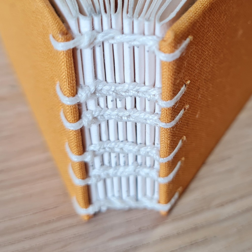The modern Sewn Boards Binding is a sewn and glued hard or soft cover book. The Sewn Boards structure’s clever design has an additional section of card sewn onto the multi-section text block that is used to support the book’s covers. Sewn using the unsupported French link stitching, the finished book has flush covers, which means that its covers are the same size as its pages. The Sewn Boards binding structure is a Bindfulness favourite – it lays flat, opens beautifully, and allows for endless design variation in the linings, spine, and covers.